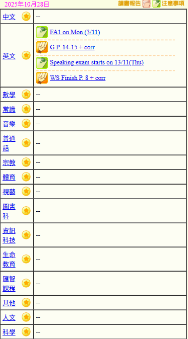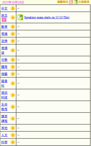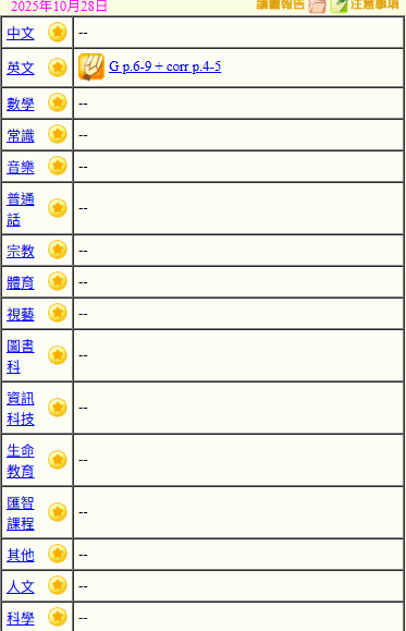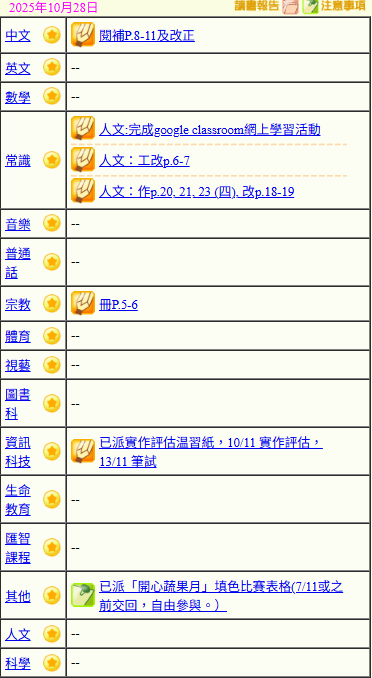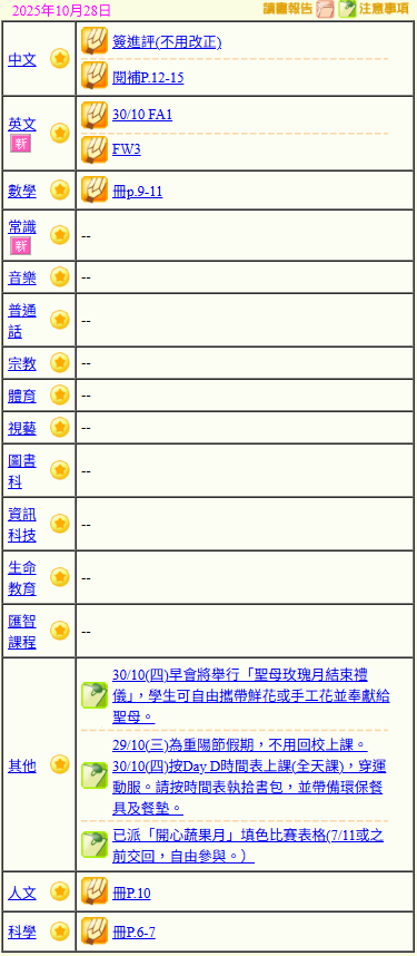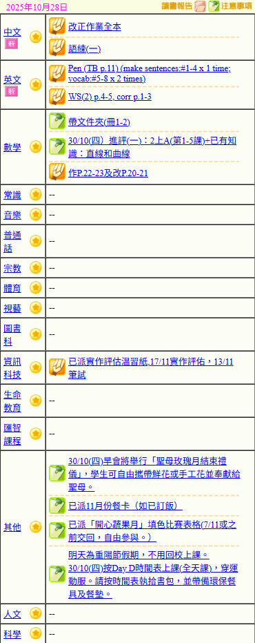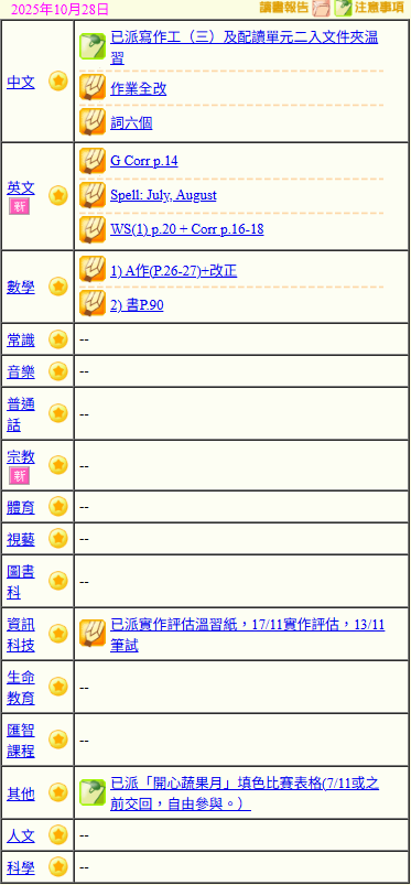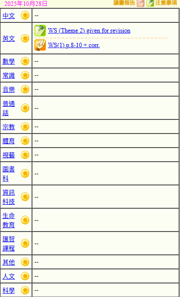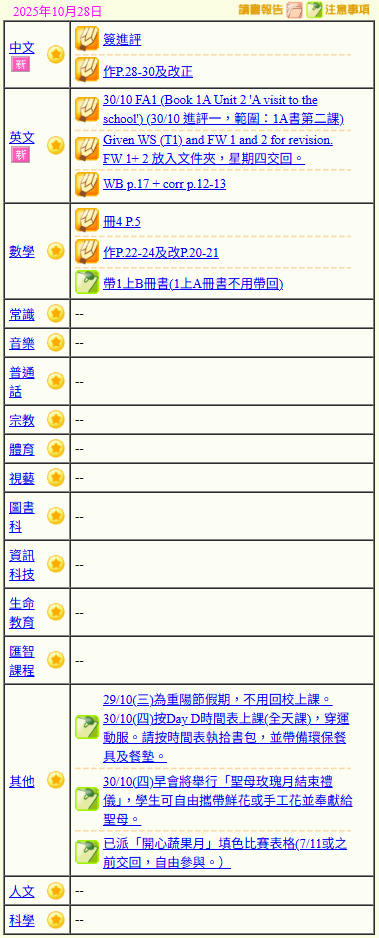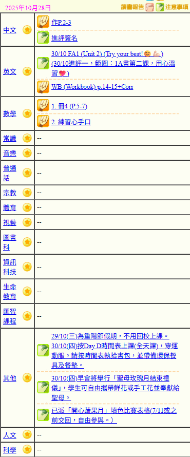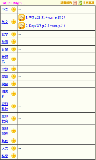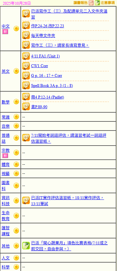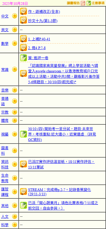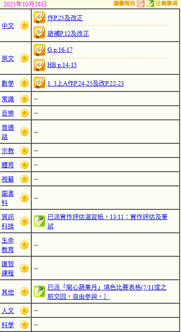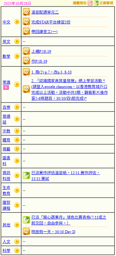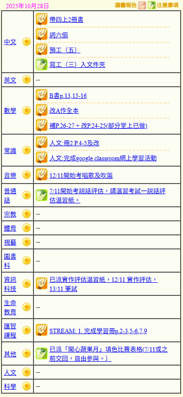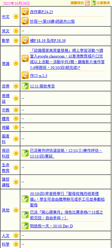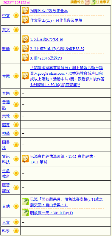 - 班別家課