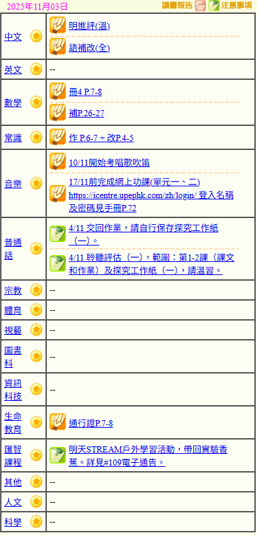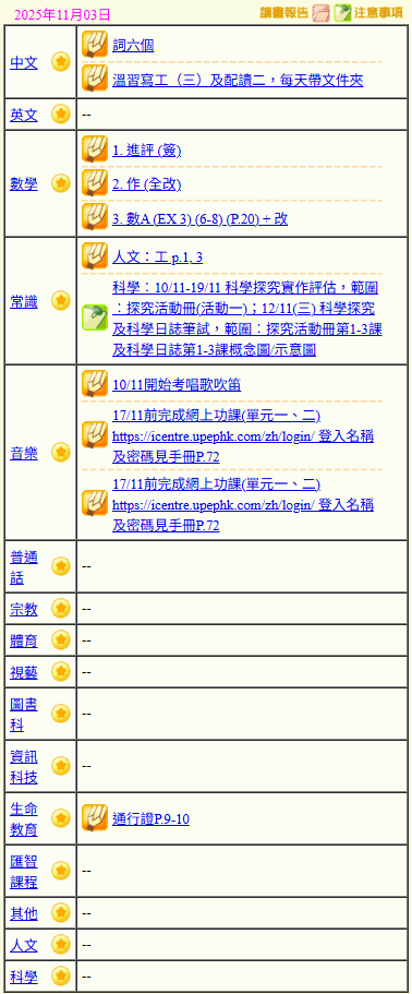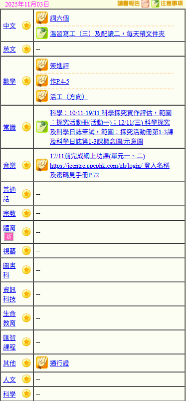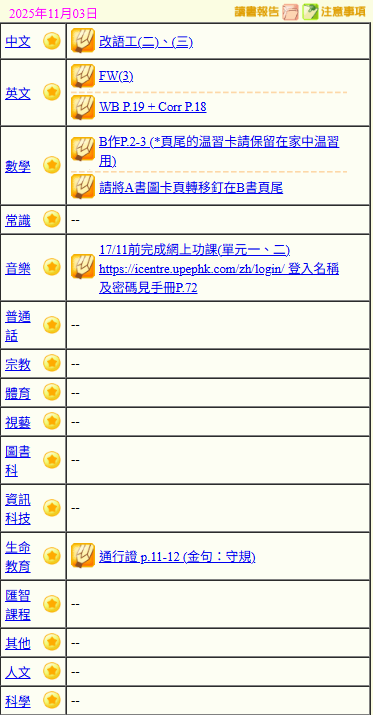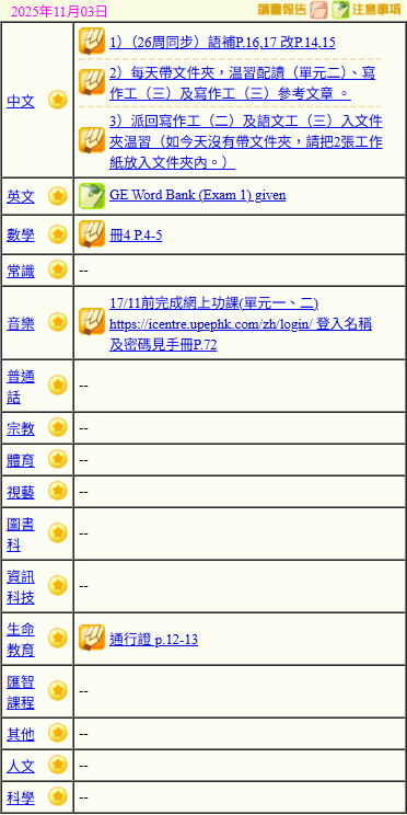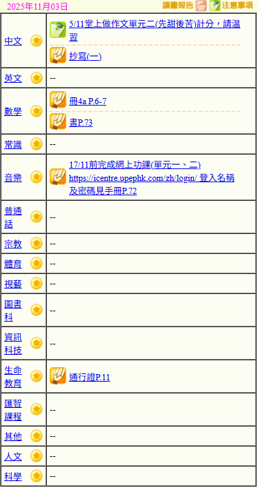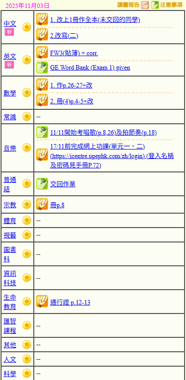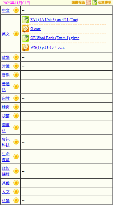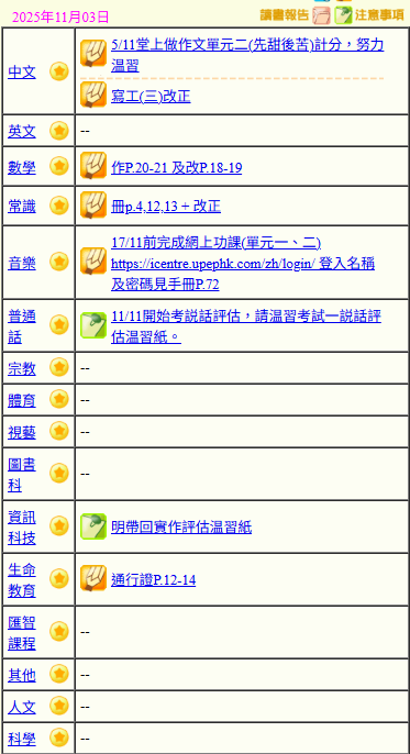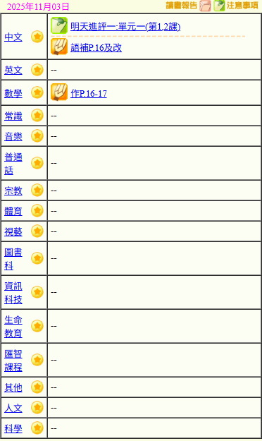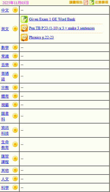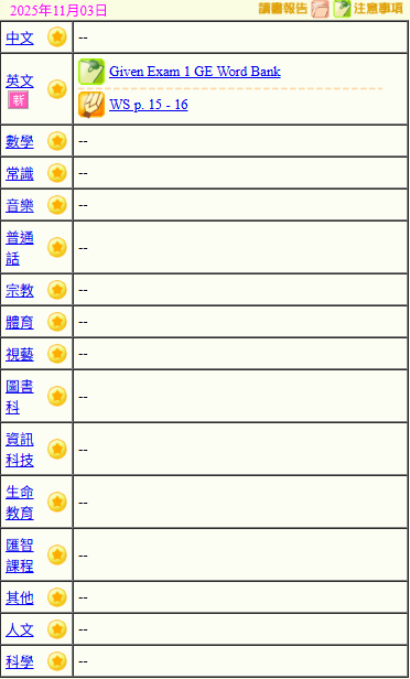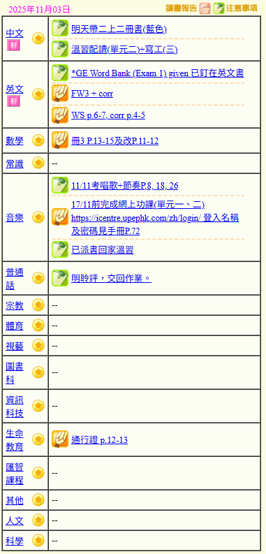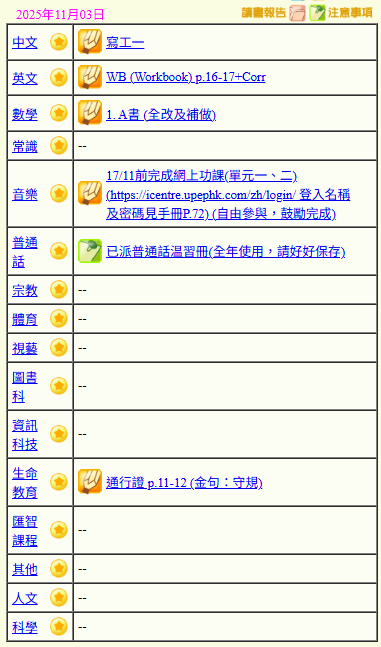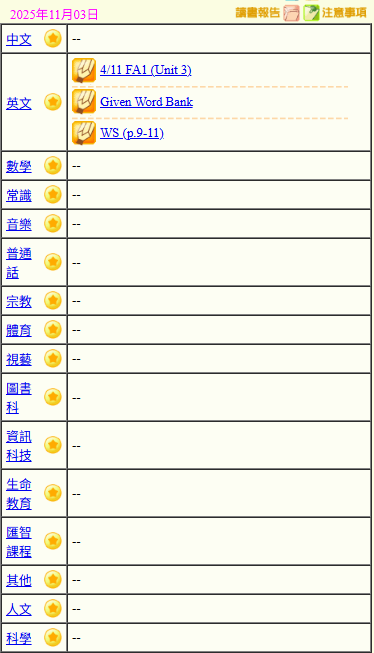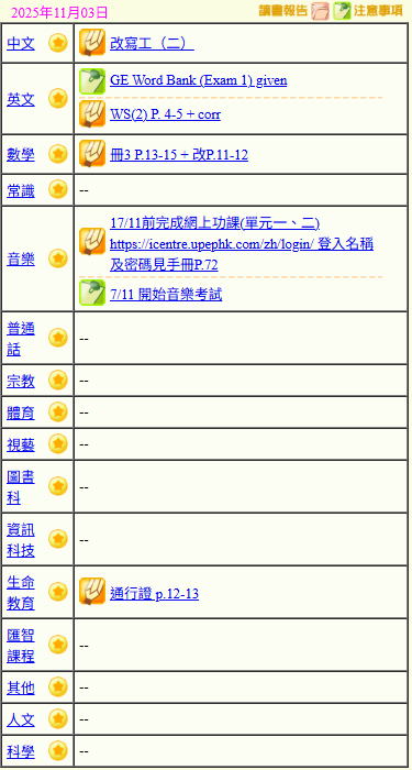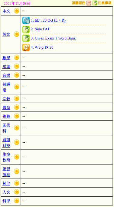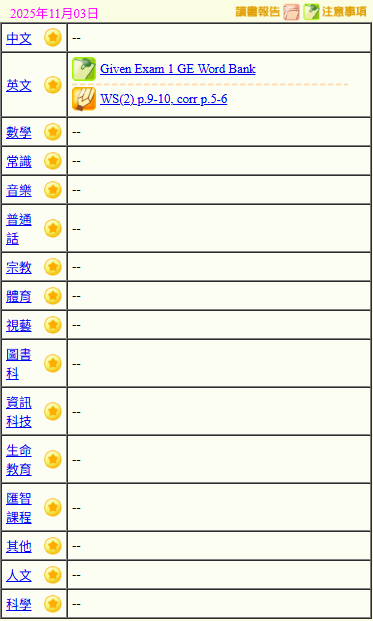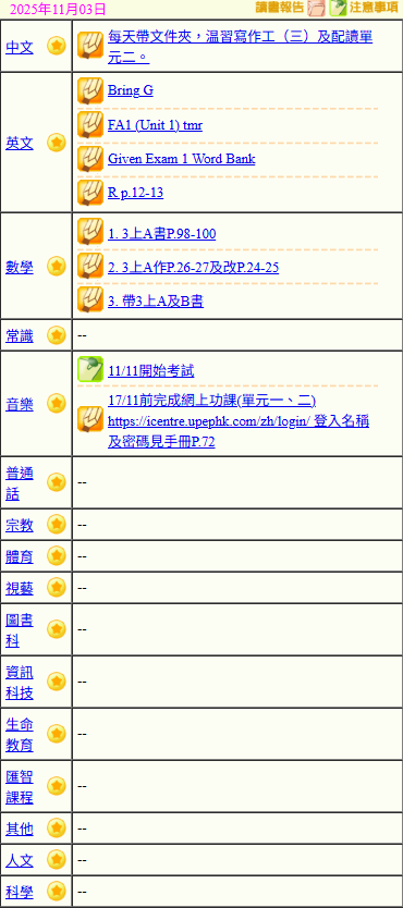 - 班別家課