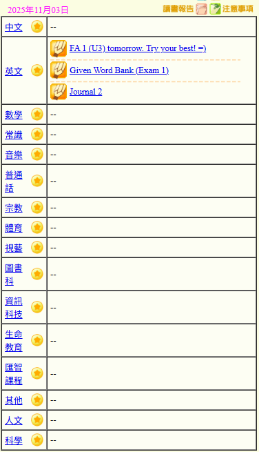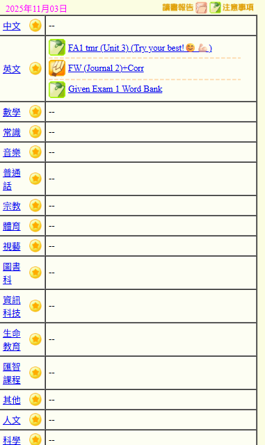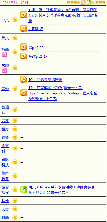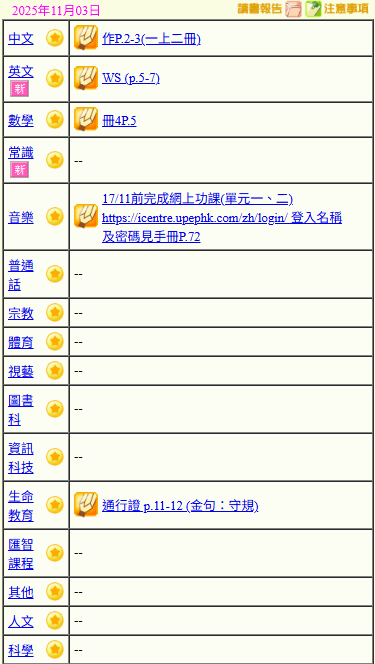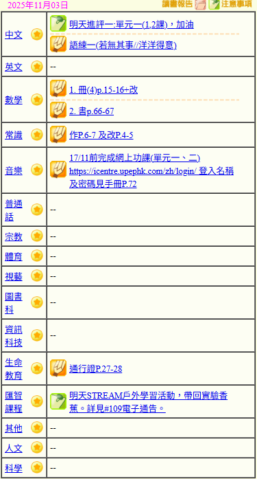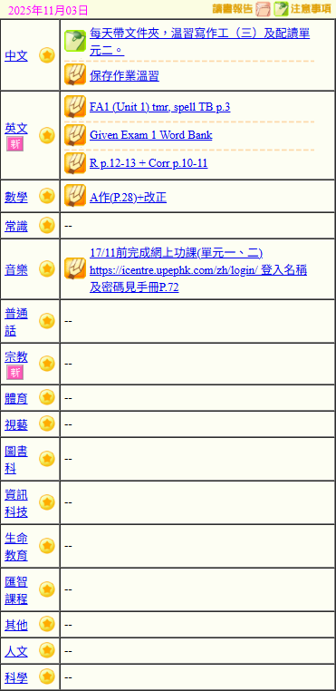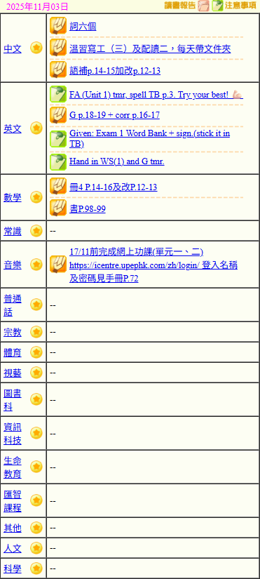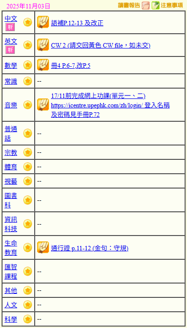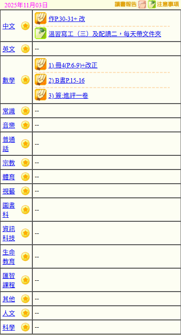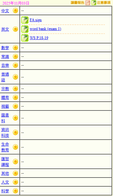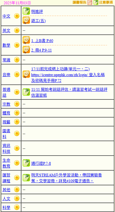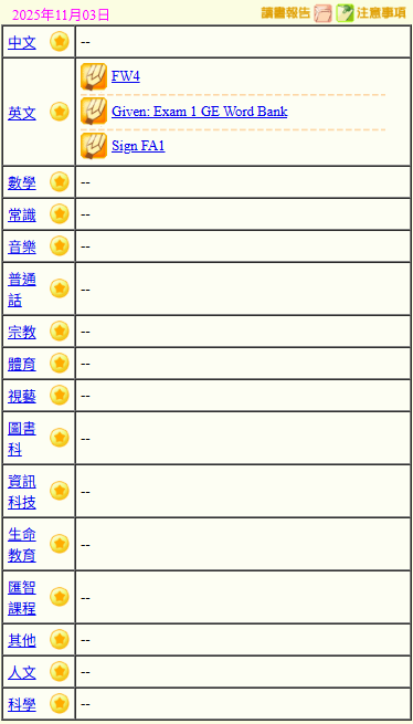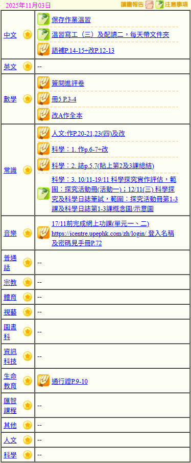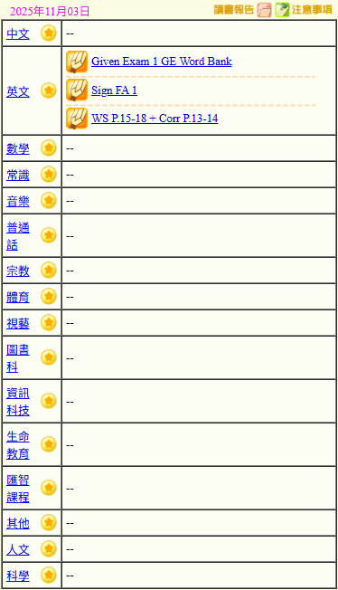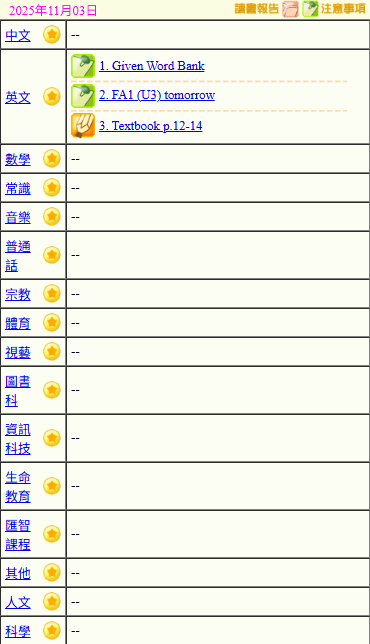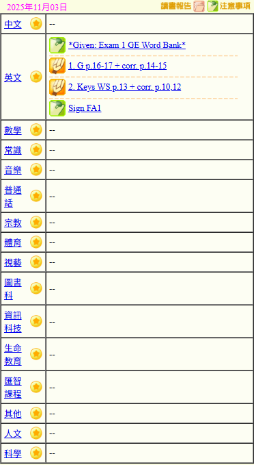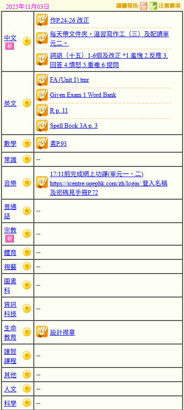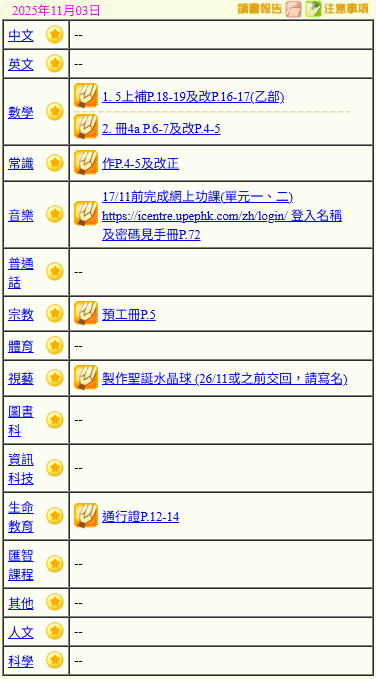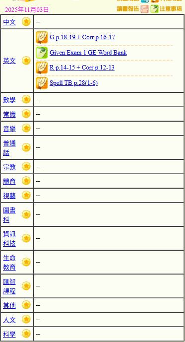 - 班別家課