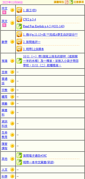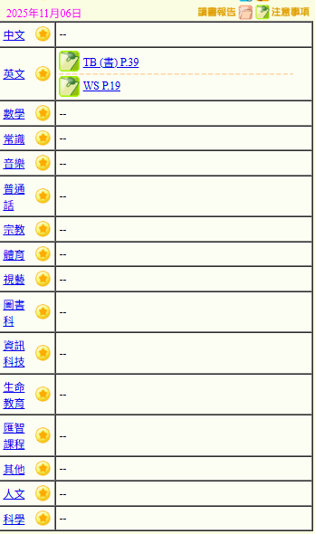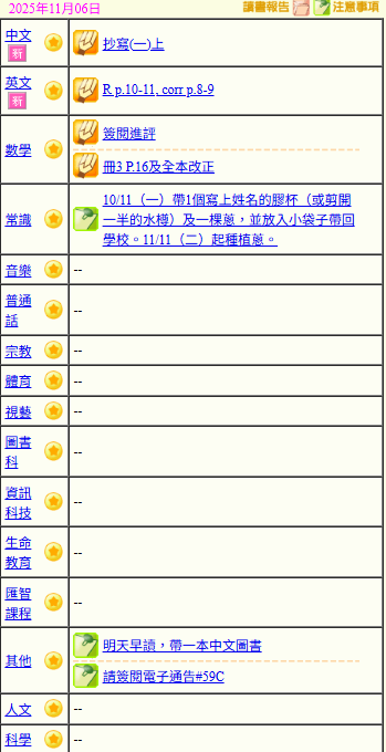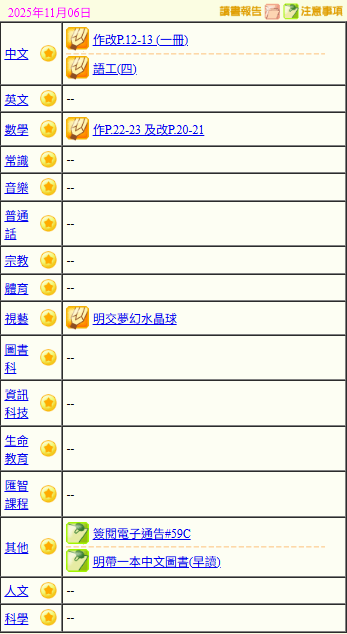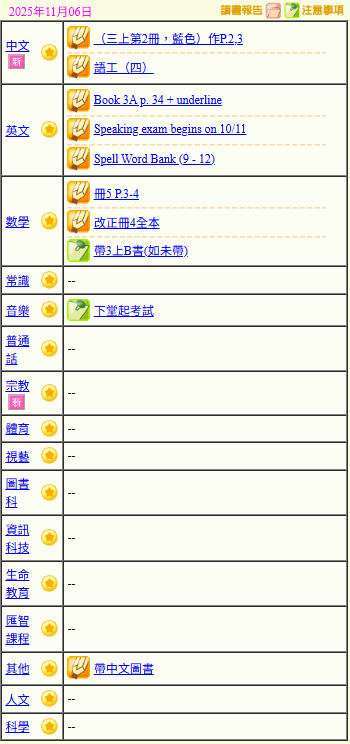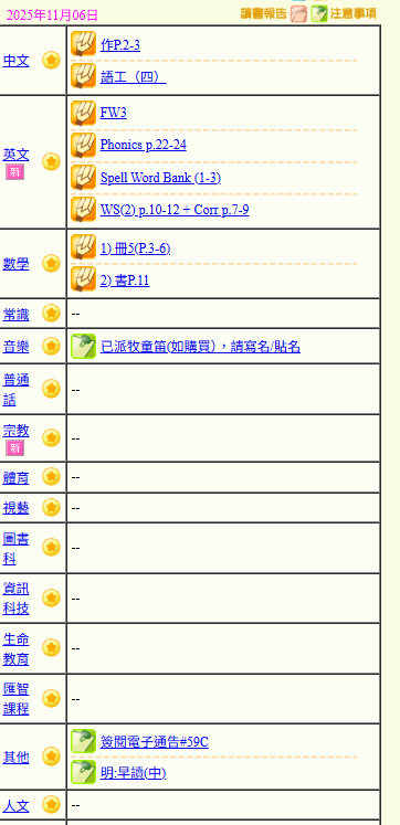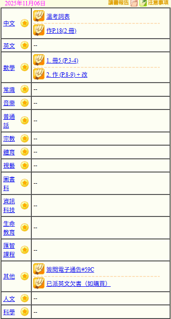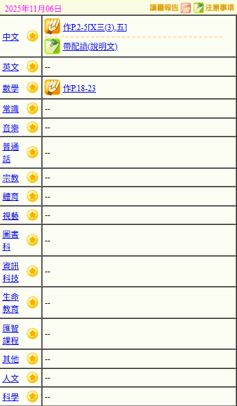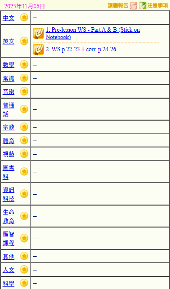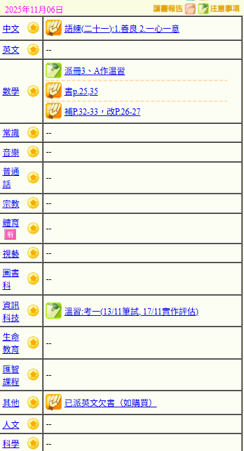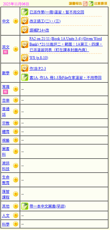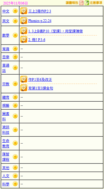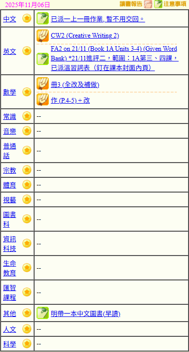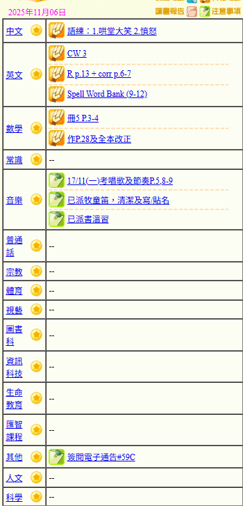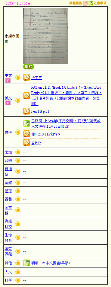 - 班別家課