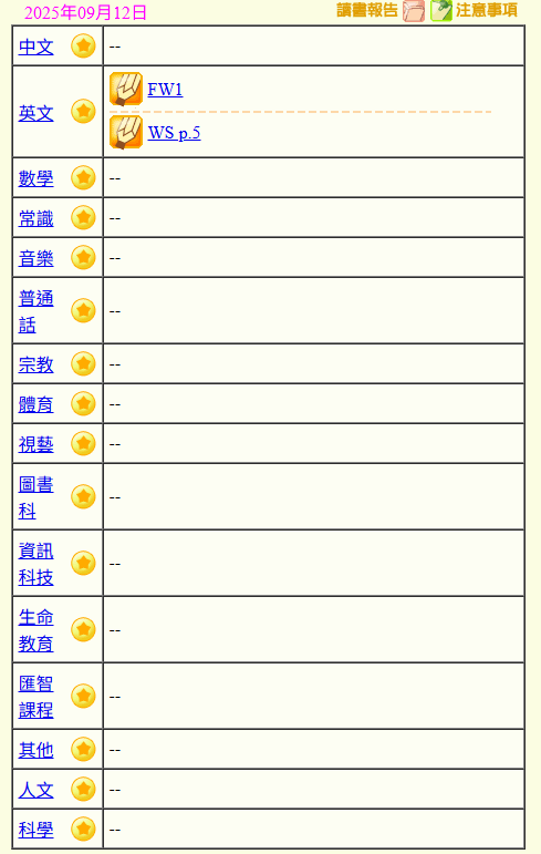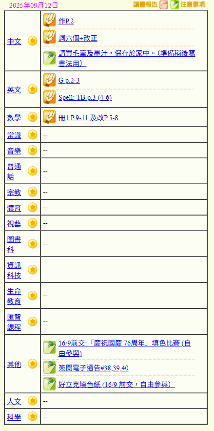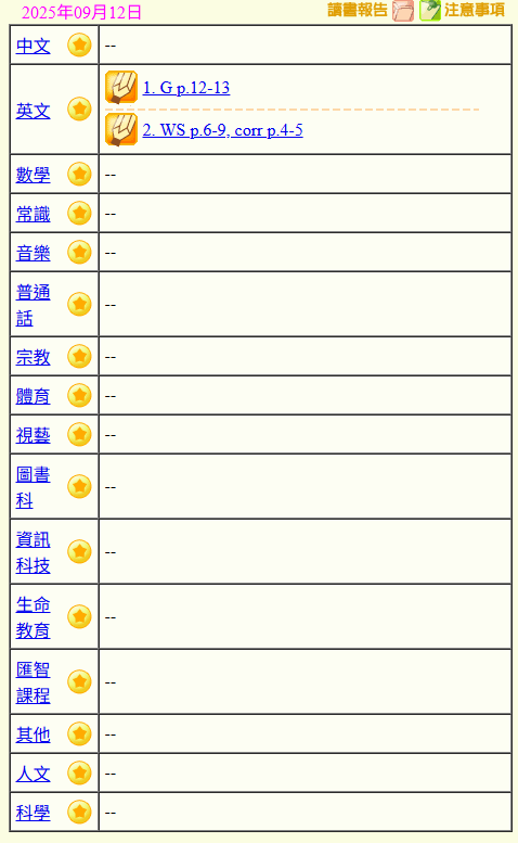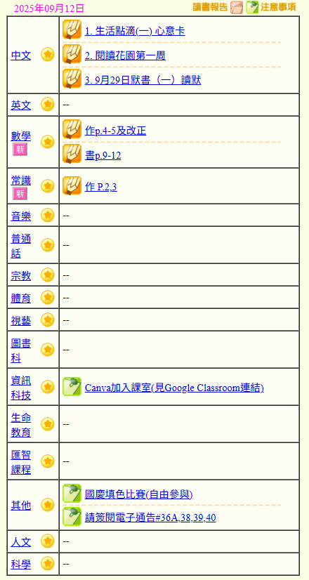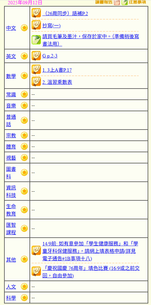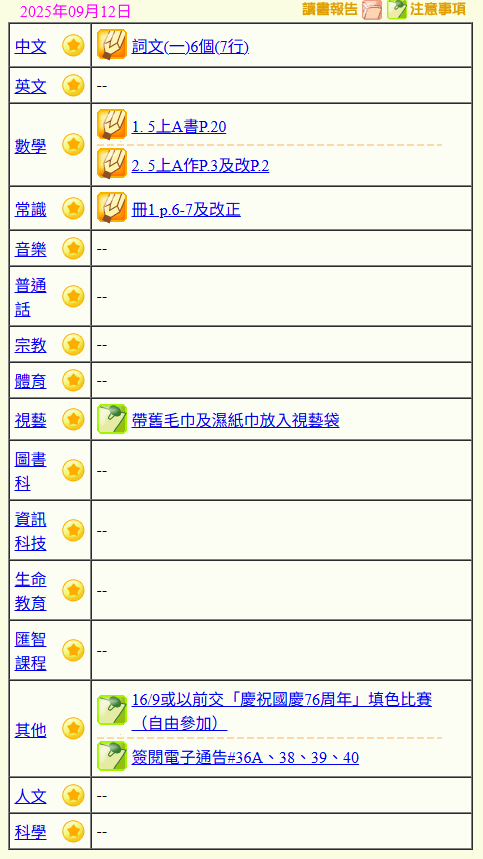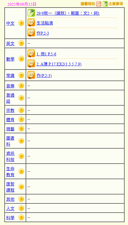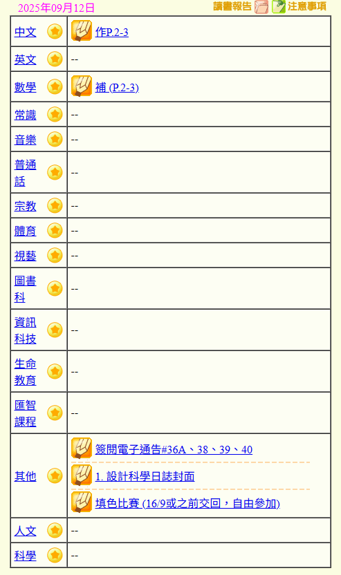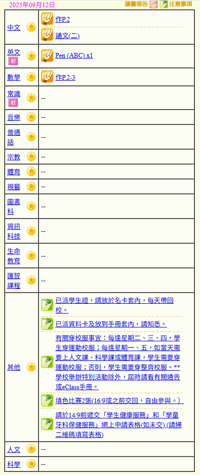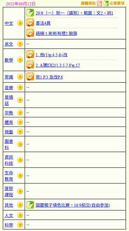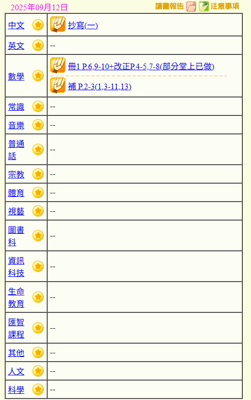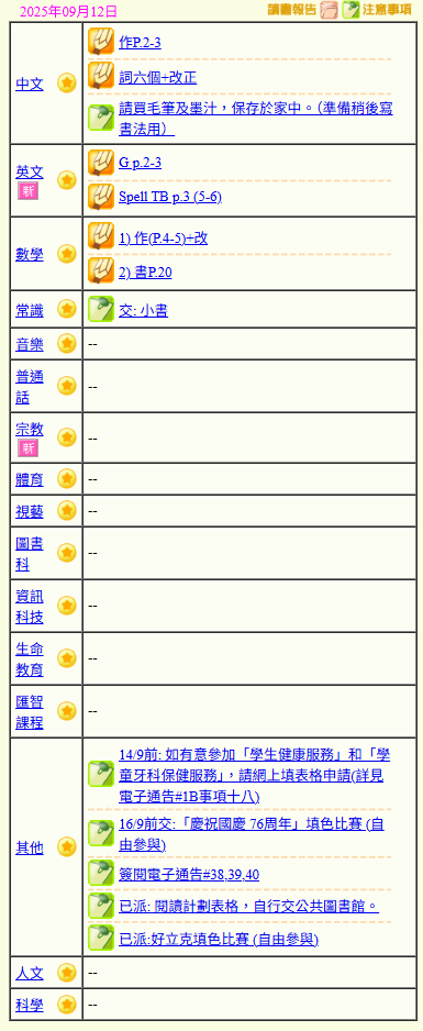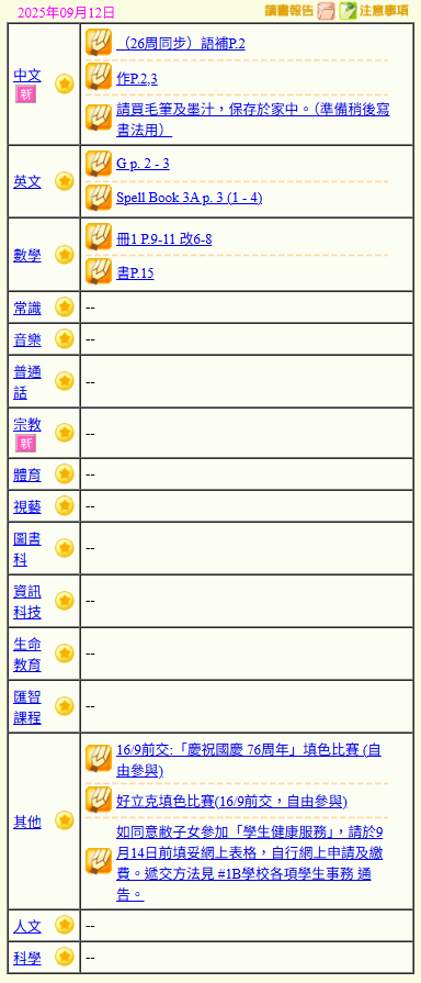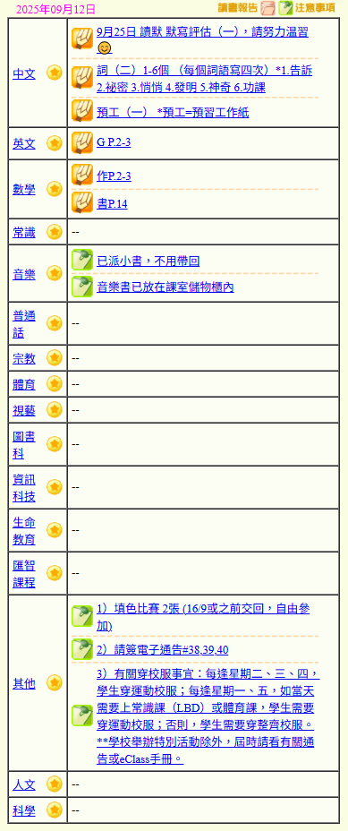 - 班別家課