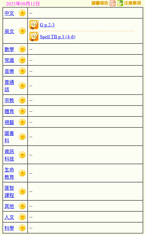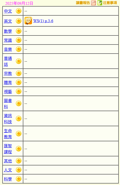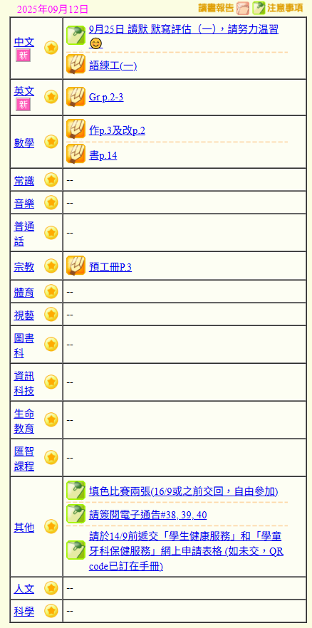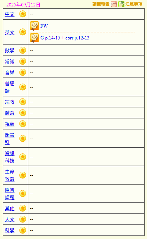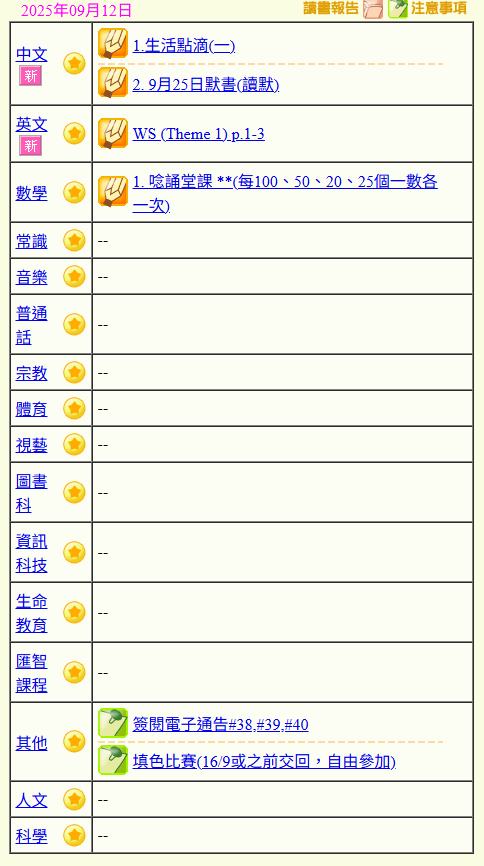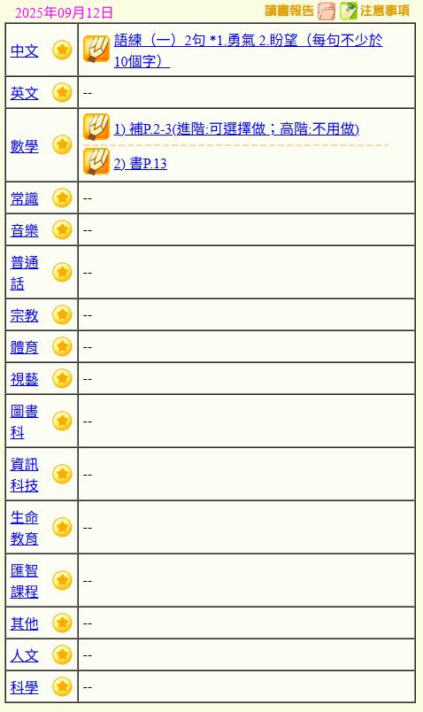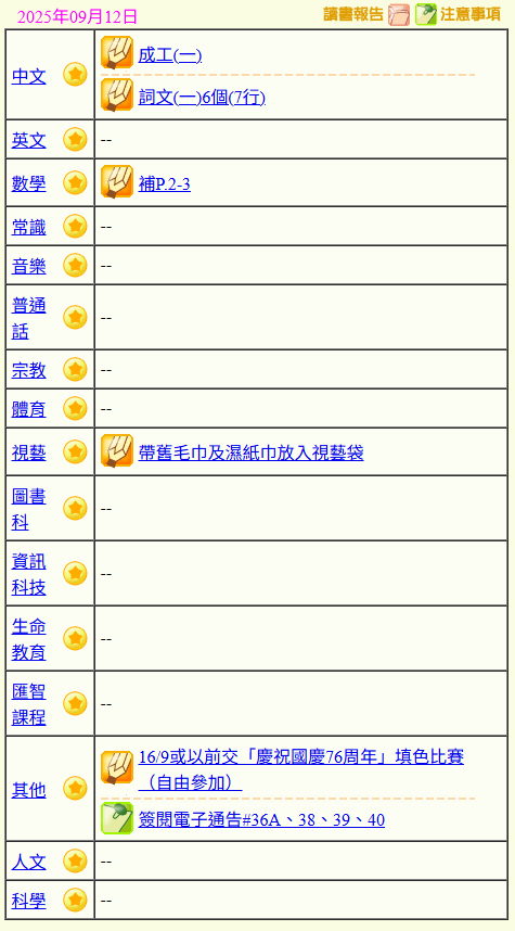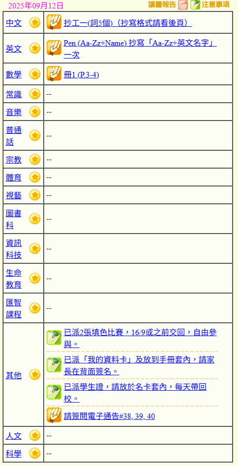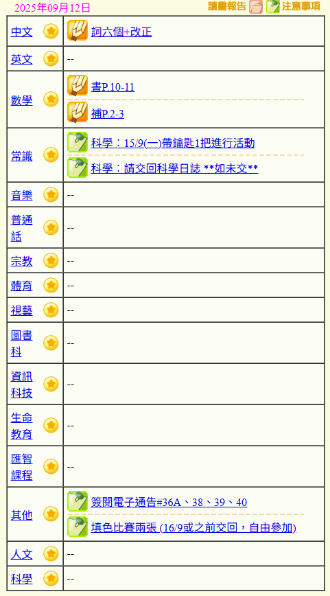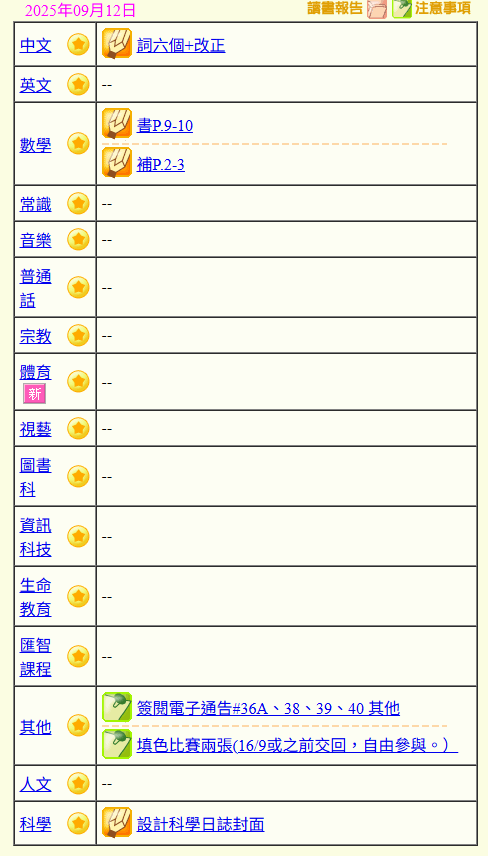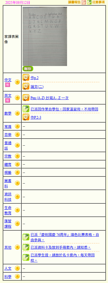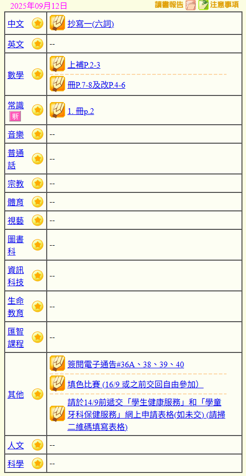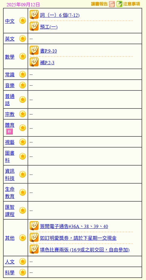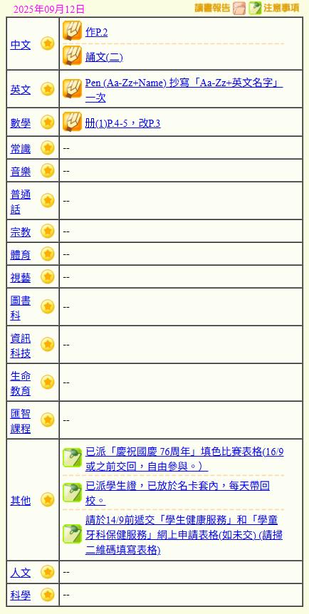 - 班別家課