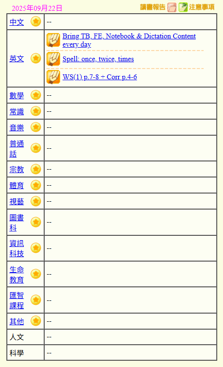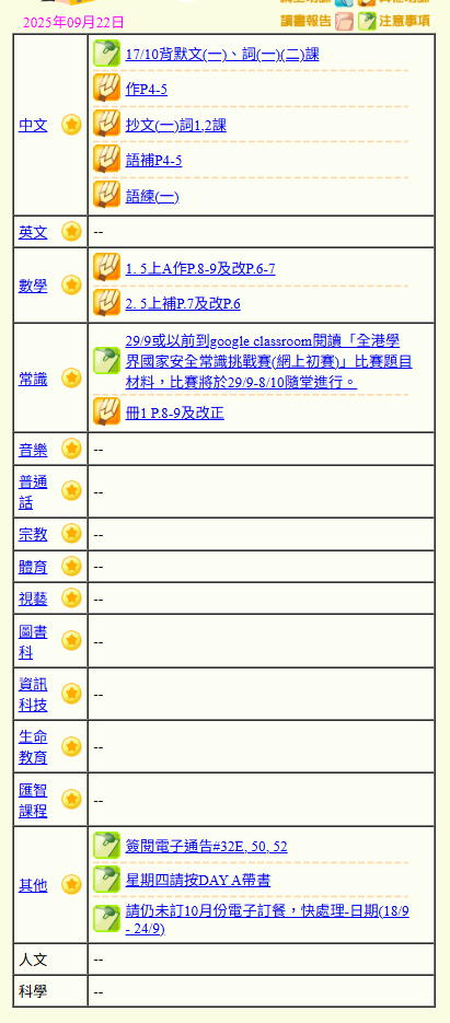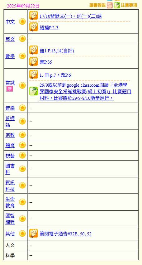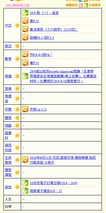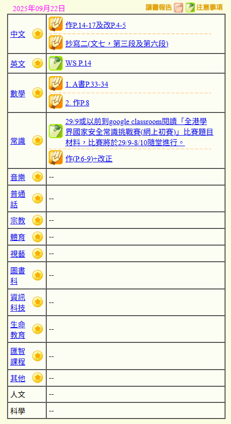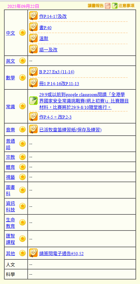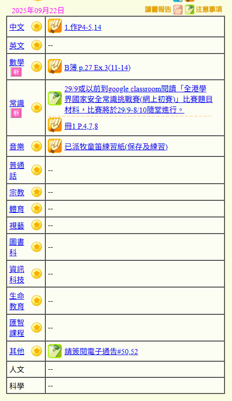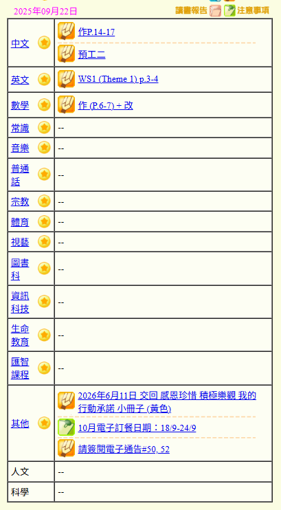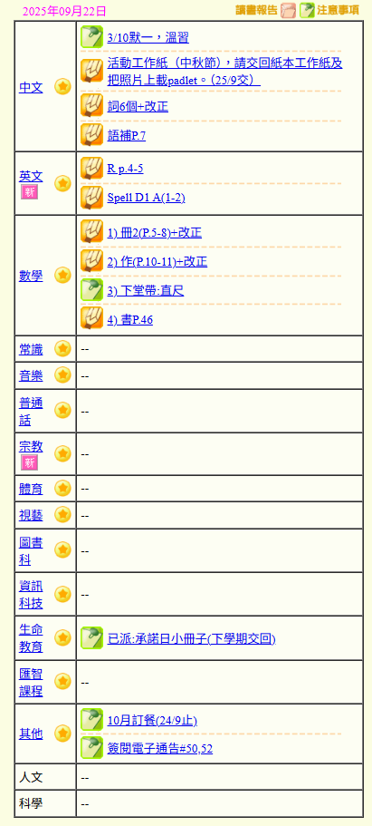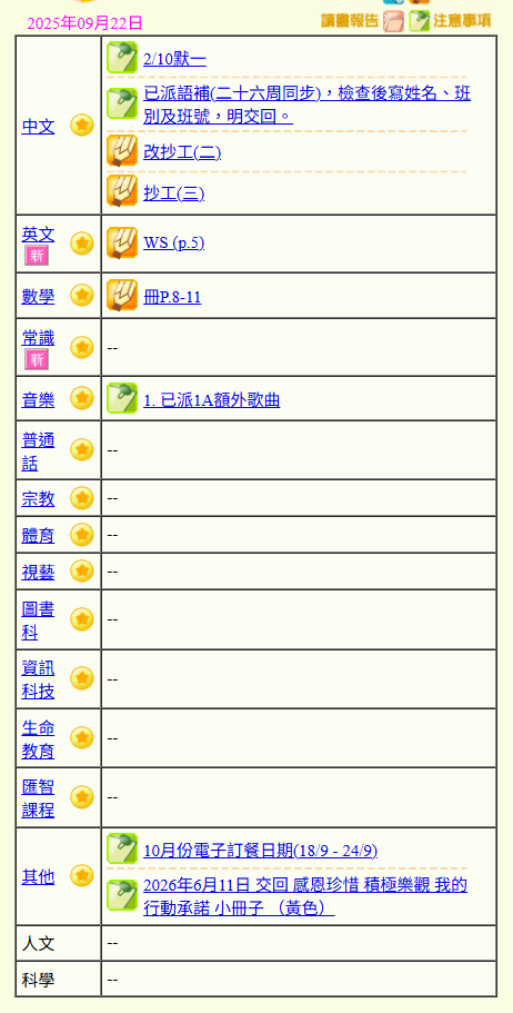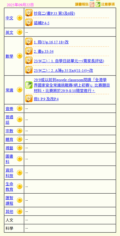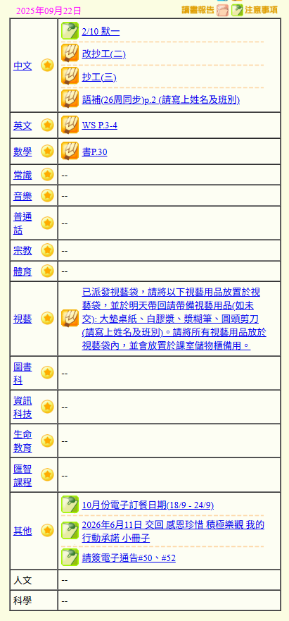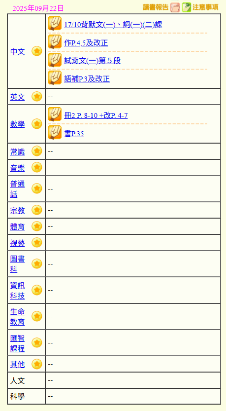 - 班別家課
