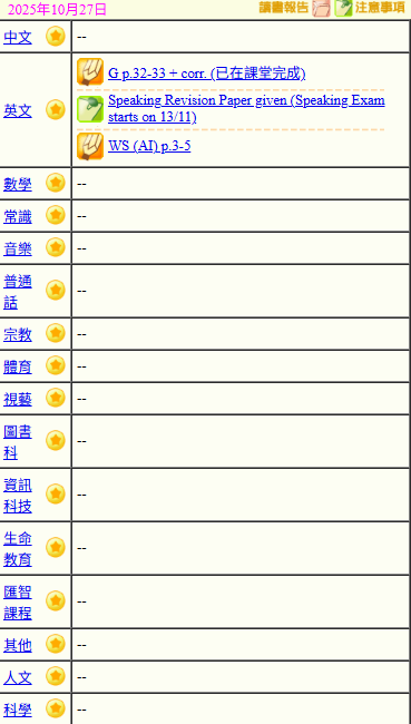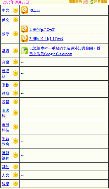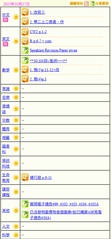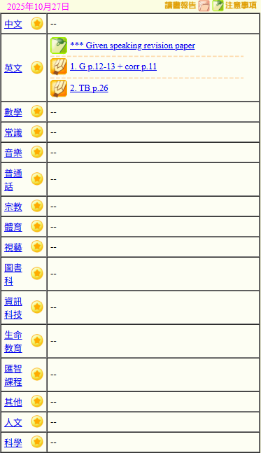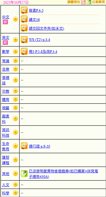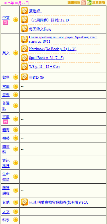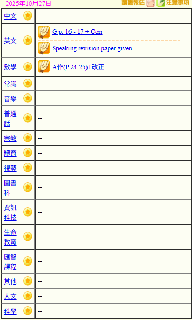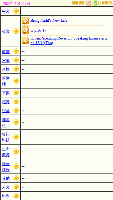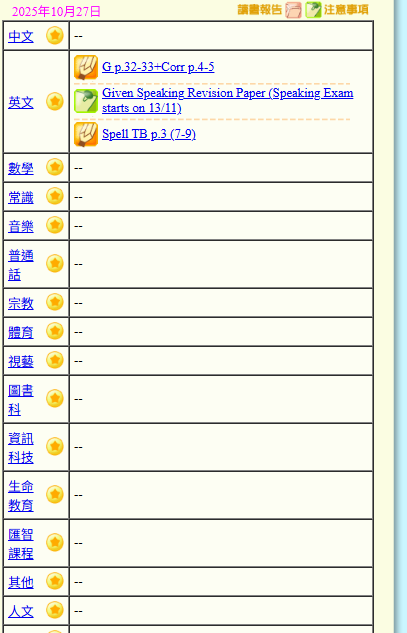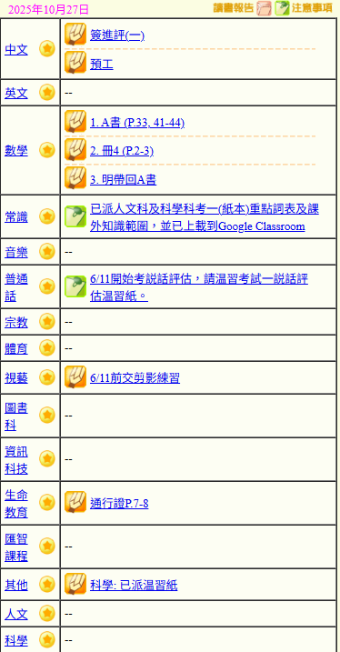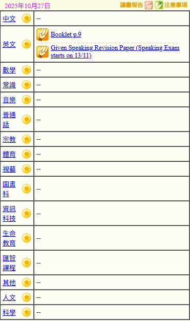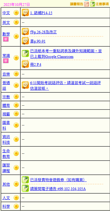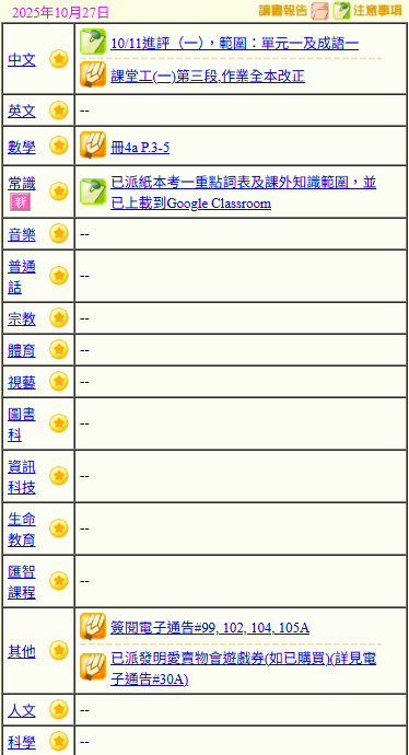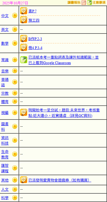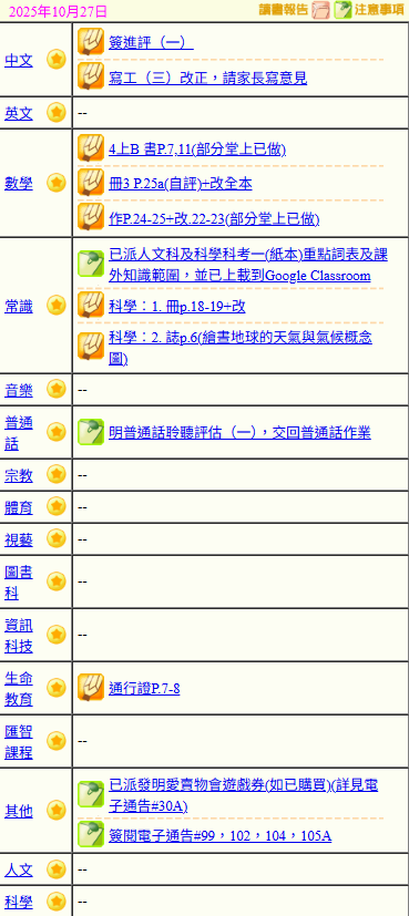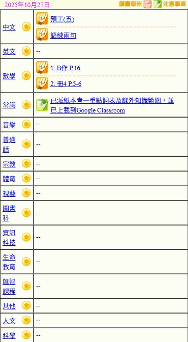- 班別家課