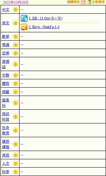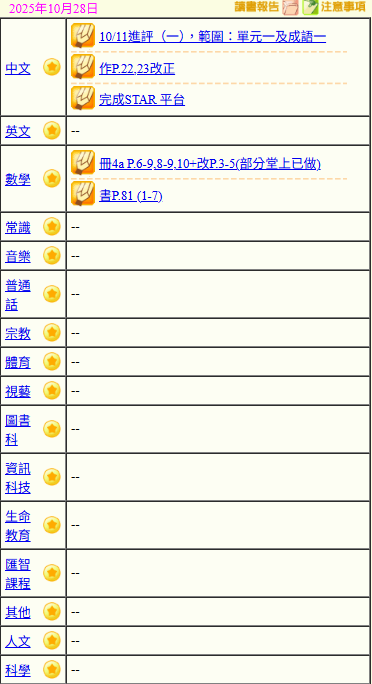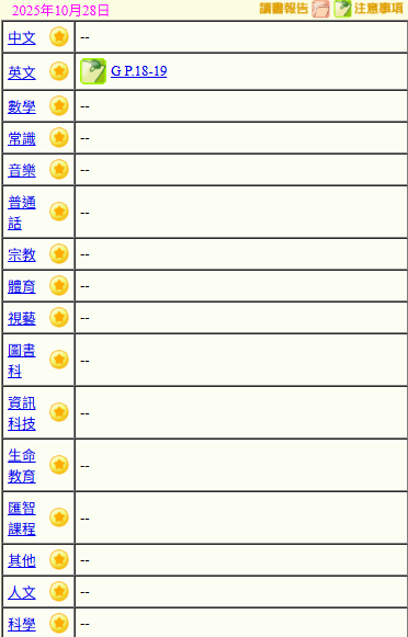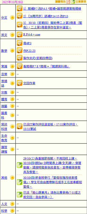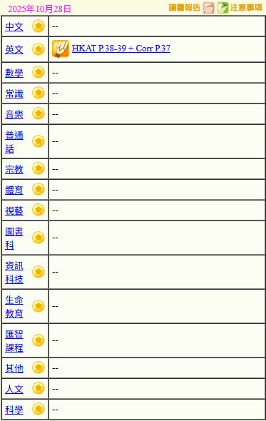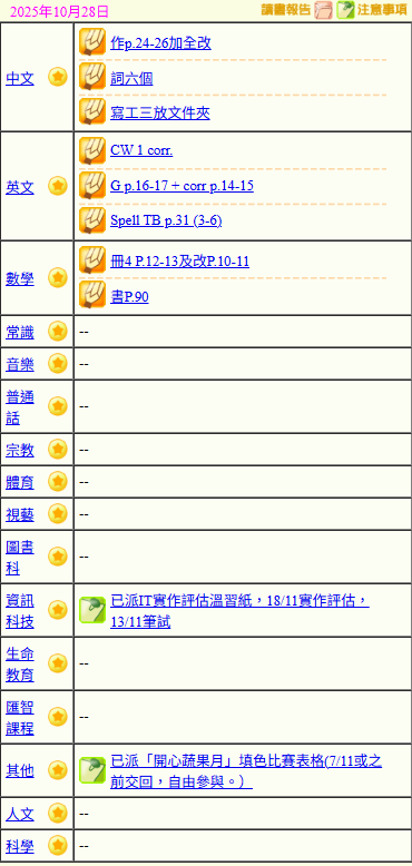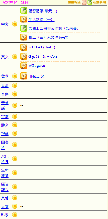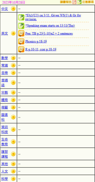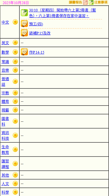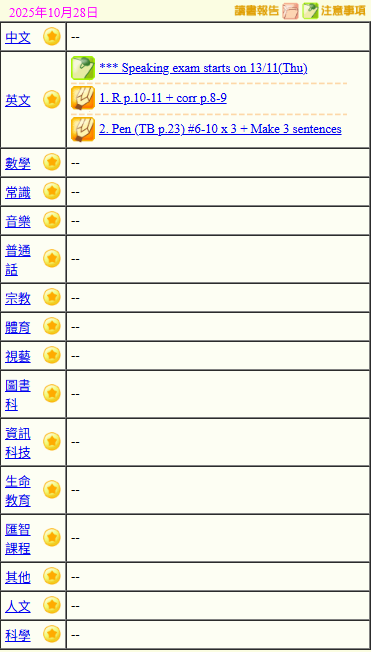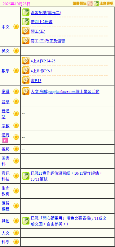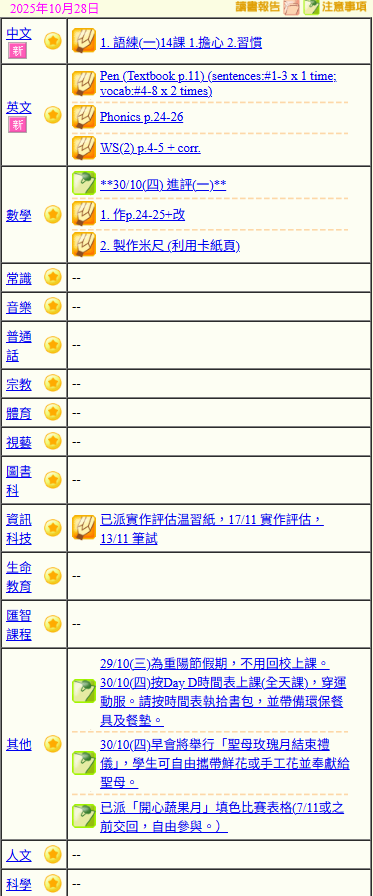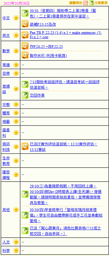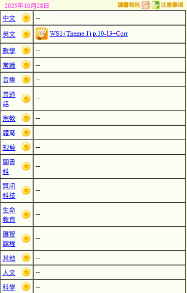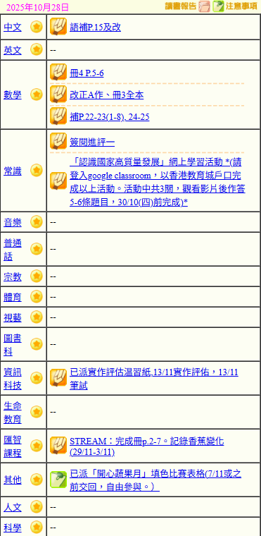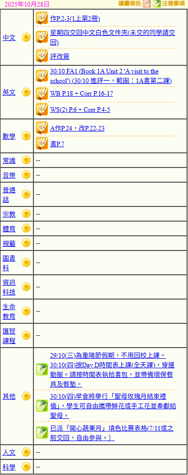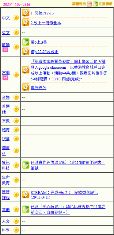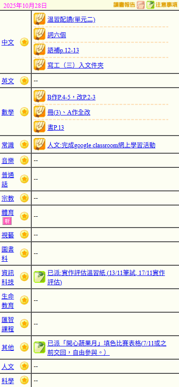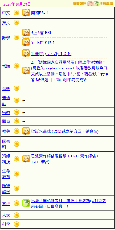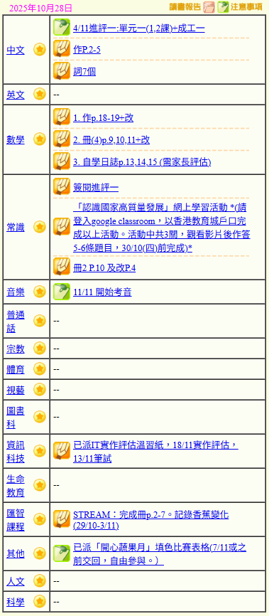 - 班別家課