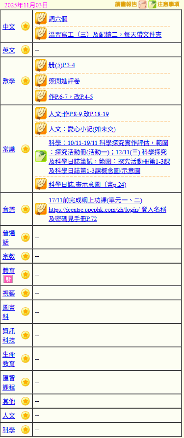 - 班別家課