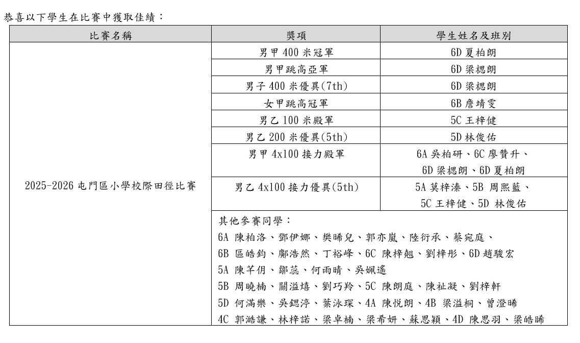 本校田徑隊於11月上旬,參與2025-2026年度屯門區小學校際田徑比賽。